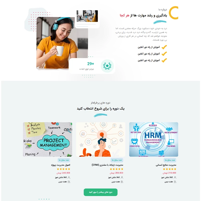 سایت آماده آموزشگاه زبان راهکاری حرفهای برای معرفی دورهها، اساتید و برنامههای آموزشی زبان است. این وبسایت با طراحی کاربرپسند و مدرن، امکان ثبتنام آنلاین، ارائه محتوای آموزشی و معرفی کلاسها را بهصورت شفاف فراهم میکند. انتخابی مناسب برای آموزشگاهها، مؤسسات زبان و فعالان حوزه آموزش آنلاین.
