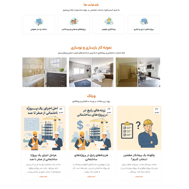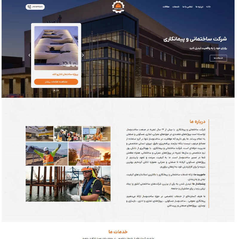 سایت آماده خدمات ساختمانی و مهندسی راهکاری ایدهآل برای معرفی پروژهها، خدمات و تخصصهای شرکتهای ساختمانی و مهندسی است. این وبسایت با طراحی مدرن و ساختار منظم، توانمندیها و نمونهکارها را بهصورت حرفهای نمایش میدهد. انتخابی مناسب برای پیمانکاران، مهندسان و شرکتهای فعال در صنعت ساختمان